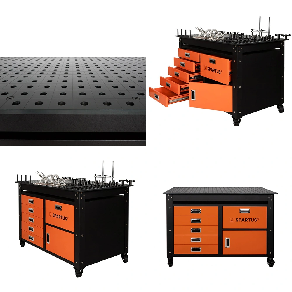 Stół spawalniczy 1200x750x820mm na kółkach, system D16, z szufladami, szafką i zestawem 62 narzędzi