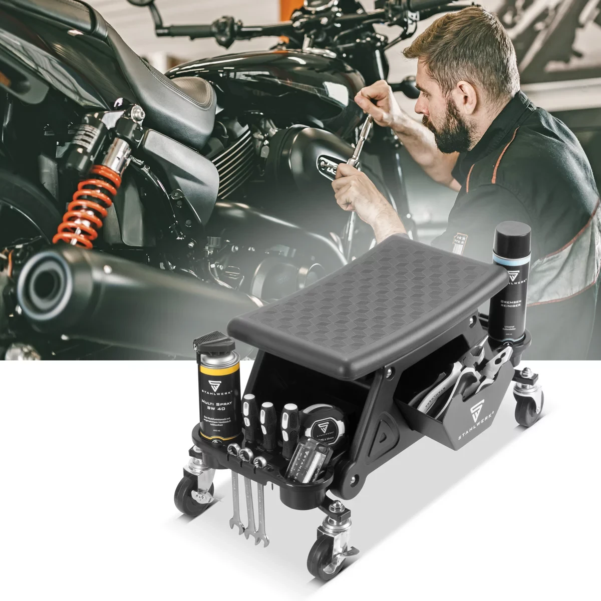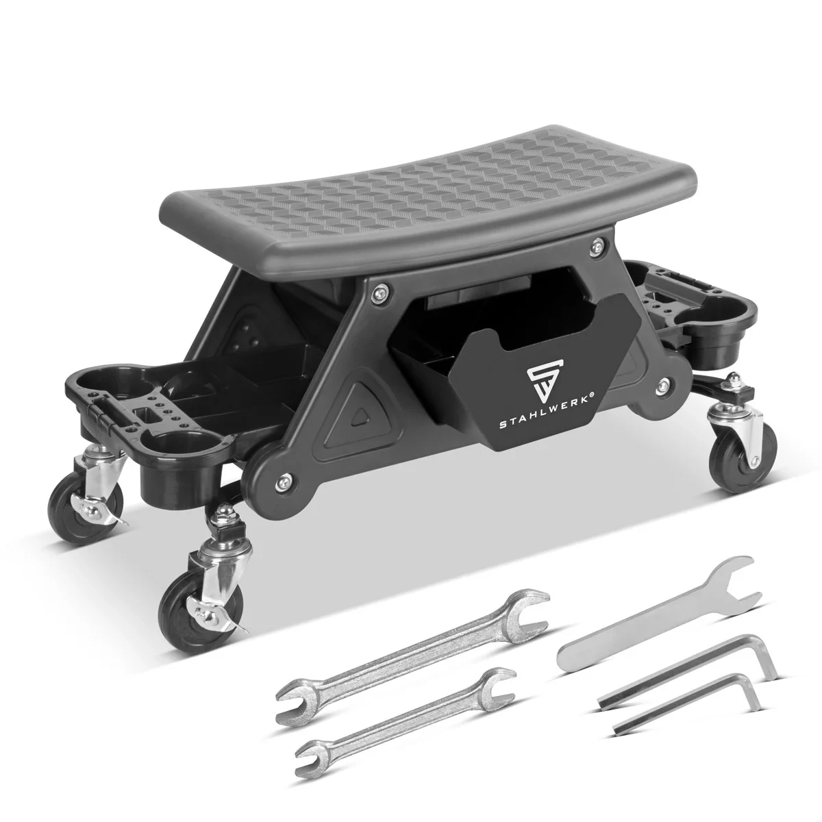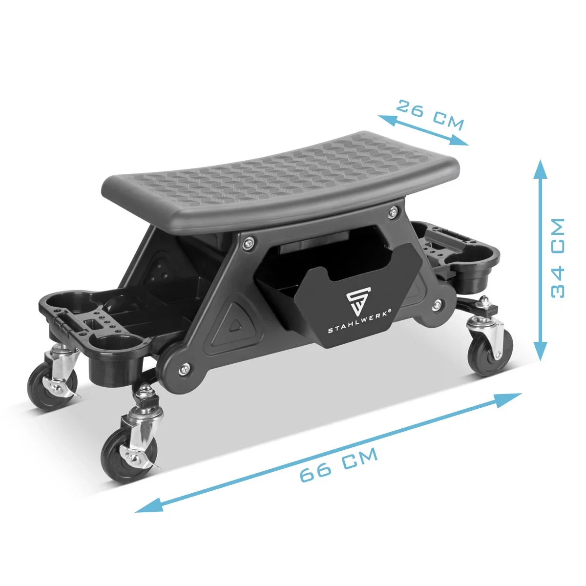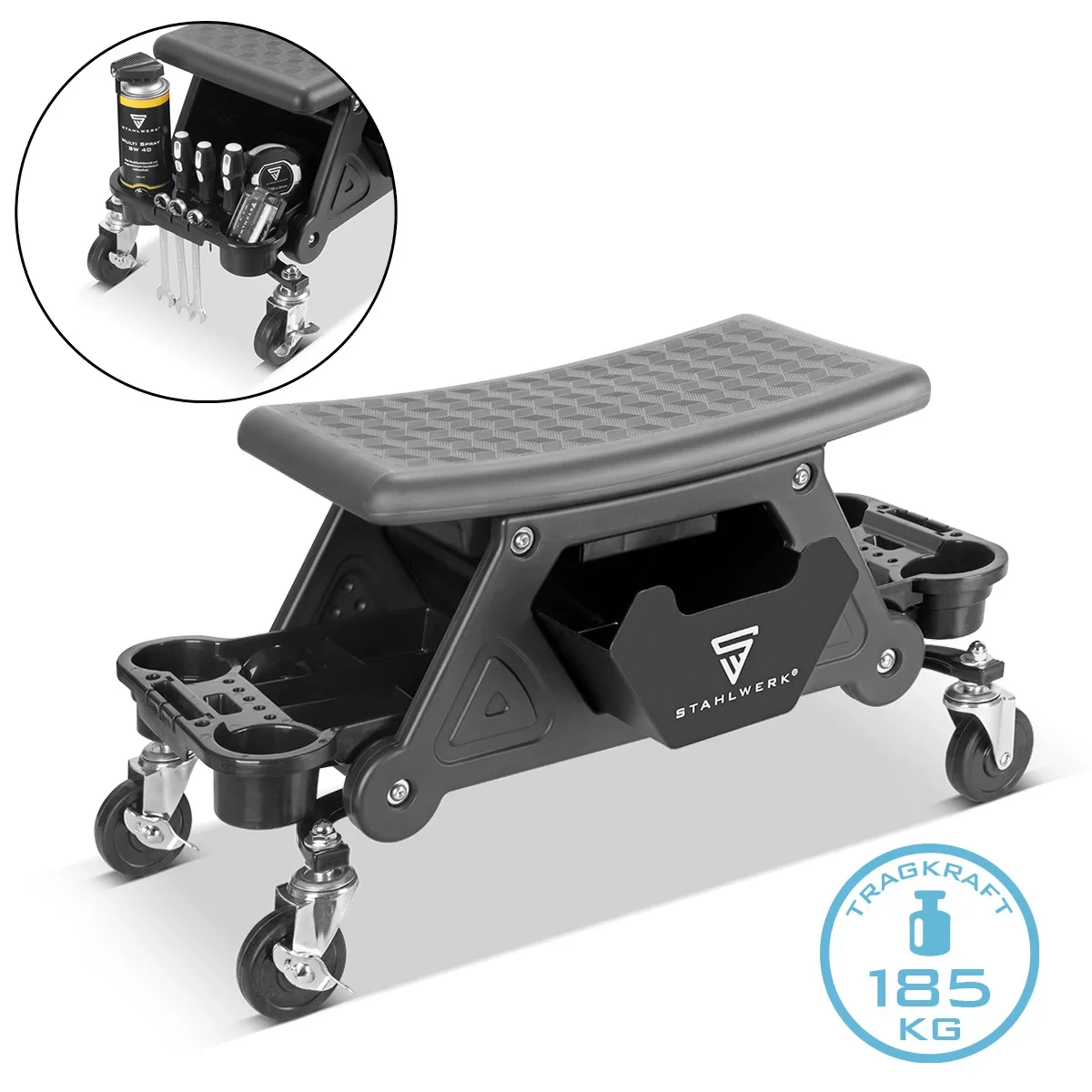 Solidna, stalowa rama odporna na skręcanie zapewnia wysoką nośność do 185 kg, a cztery kółka obrotowe umożliwiają łatwe manewrowanie stołkiem nawet przy pełnym obciążeniu. Duże siedzisko wykonane z wytrzymałego tworzywa sztucznego gwarantuje komfort podczas długotrwałej pracy, a kompaktowa konstrukcja pozwala na użycie stołka nawet w niewielkich przestrzeniach warsztatowych. Dzięki wysokiej jakości materiałom i starannemu wykończeniu taboret warsztatowy STAHLWERK WRS-185 jest odporny na intensywne użytkowanie, zachowuje stabilność i wytrzymałość przez długi czas. Mobilny stołek stanowi więc nie tylko wygodne siedzisko, ale również funkcjonalny system organizacji narzędzi.