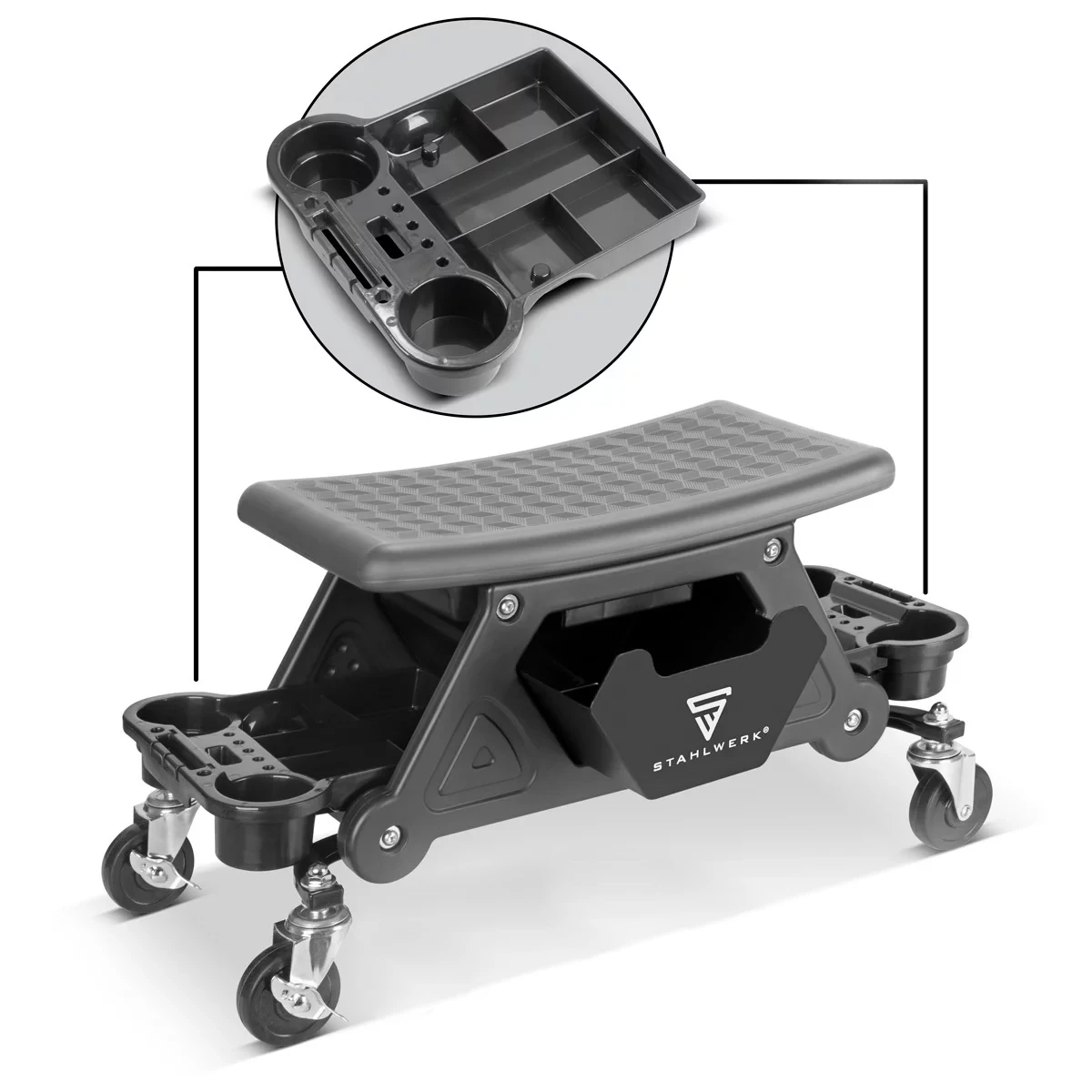 Mobilny stołek warsztatowy STAHLWERK WRS-185 ST łączy w sobie funkcjonalność, wygodę i trwałość, co czyni go niezastąpionym narzędziem w każdym profesjonalnym warsztacie. Wyposażony w przestronną szufladę, dwa boczne schowki z tacami o różnych rozmiarach oraz cztery zintegrowane uchwyty na puszki, pozwala na przechowywanie zarówno dużych, jak i drobnych narzędzi, śrub czy akcesoriów w zasięgu ręki. Płynnie działająca szuflada zapewnia szybki i wygodny dostęp do potrzebnych elementów, co znacząco zwiększa efektywność pracy.
