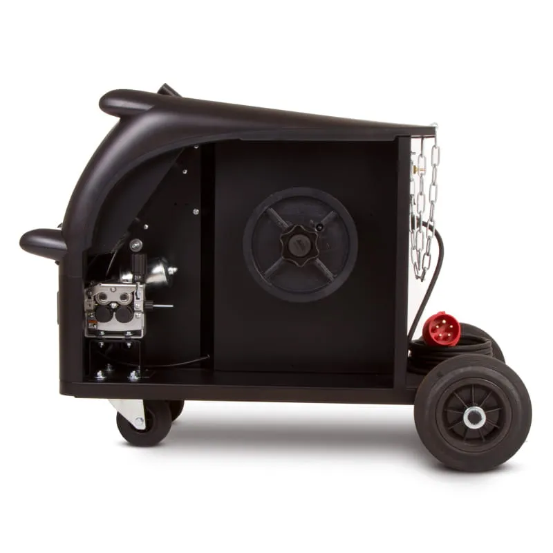 PODWOZIE JEZDNE - półautomat ma solidne koła, w tym dwa przednie skrętne, które gwarantują dużą mobilność i dają możliwość przemieszczania spawarki po nierównym podłożu. Dodatkowo zyskujemy dedykowane miejsce na butle z gazem.