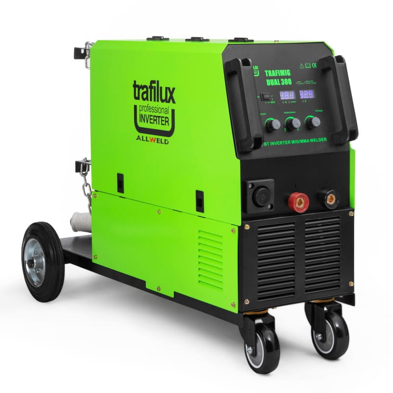 TRAFILUX TRAFIMIG DUAL 300 to profesjonalny inwerterowy półautomat spawalniczy, znajdujący swoje zastosowanie w spawaniu stali niskowęglowej, niskostopowej MAG, stali stopowej MIG oraz stopów aluminium. Urządzenie zapewnia możliwość spawania elektrodami otulonymi (funkcja MMA). TRAFIMIG Dual 300 posiada wbudowany system wykrywania napięcia zasilania, dzięki czemu może być zasilany zarówno z sieci 400V, jak i 230V.