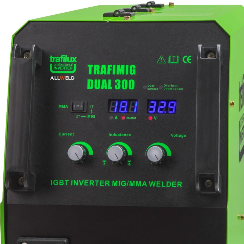 TRAFILUX TRAFIMIG DUAL 300 to profesjonalny inwerterowy półautomat spawalniczy, znajdujący swoje zastosowanie w spawaniu stali niskowęglowej, niskostopowej MAG, stali stopowej MIG oraz stopów aluminium. Urządzenie zapewnia możliwość spawania elektrodami otulonymi (funkcja MMA). TRAFIMIG Dual 300 posiada wbudowany system wykrywania napięcia zasilania, dzięki czemu może być zasilany zarówno z sieci 400V, jak i 230V, dając urządzeniu uniwersalność w swoim zastosowaniu, oraz pozwala na pracę w miejscach gdzie nie ma dostępu do sieci trójfazowej.