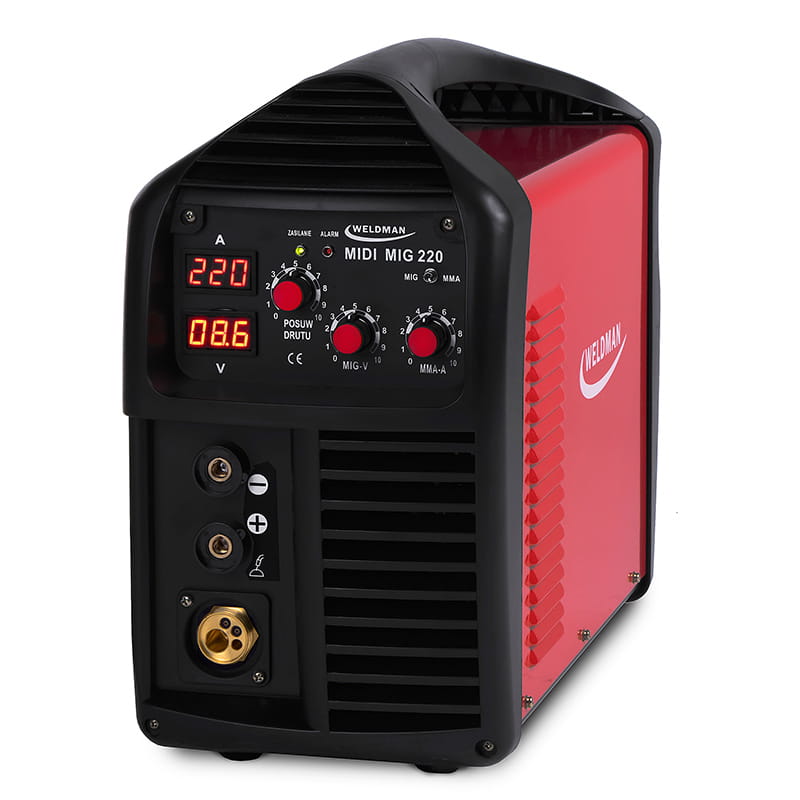 Spawarka migomat WELDMAN MIDI MIG 220 jest to półautomat wykonany na bazie komponentów IGBT. Urządzenie zaprojektowane do spawania metodami MIG/MAG i MMA stali węglowych, stopowych, nierdzewnych, kwasoodpornych, odlewów żeliwnych i aluminium. Znamionowy prąd spawania 220 A w cyklu 60 %.
