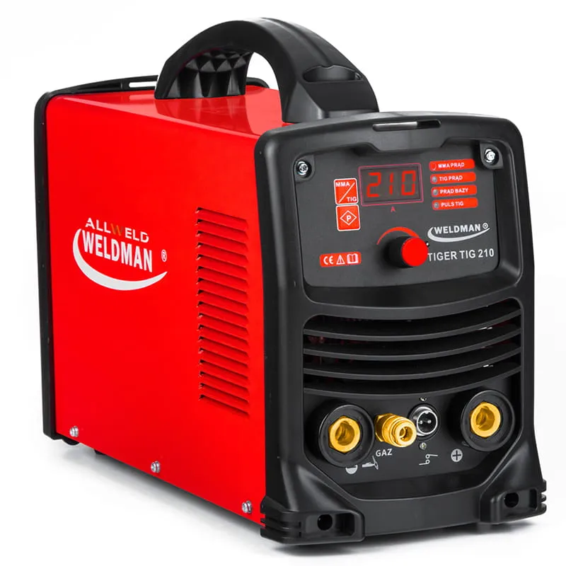 Spawarka WELDMAN TIGER TIG 210 DC to  urządzenie do spawania metodą TIG DC stali, miedzi, nierdzewki, kwasówki i innych spawalnych materiałów. Duża moc 210A, gwarantuje uzyskanie przetopu ok. 5mm i daje nam możliwość spawania elementów do 10mm grubości. Urządzenie działa w oparciu o nowoczesne tranzystory IGBT oraz bezstykową inicjację łuku HF. Całość została zamknięta w małej i kompaktowej obudowie, której masa wacha się w granicach tylko 8 Kg.