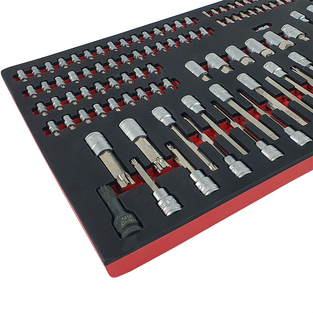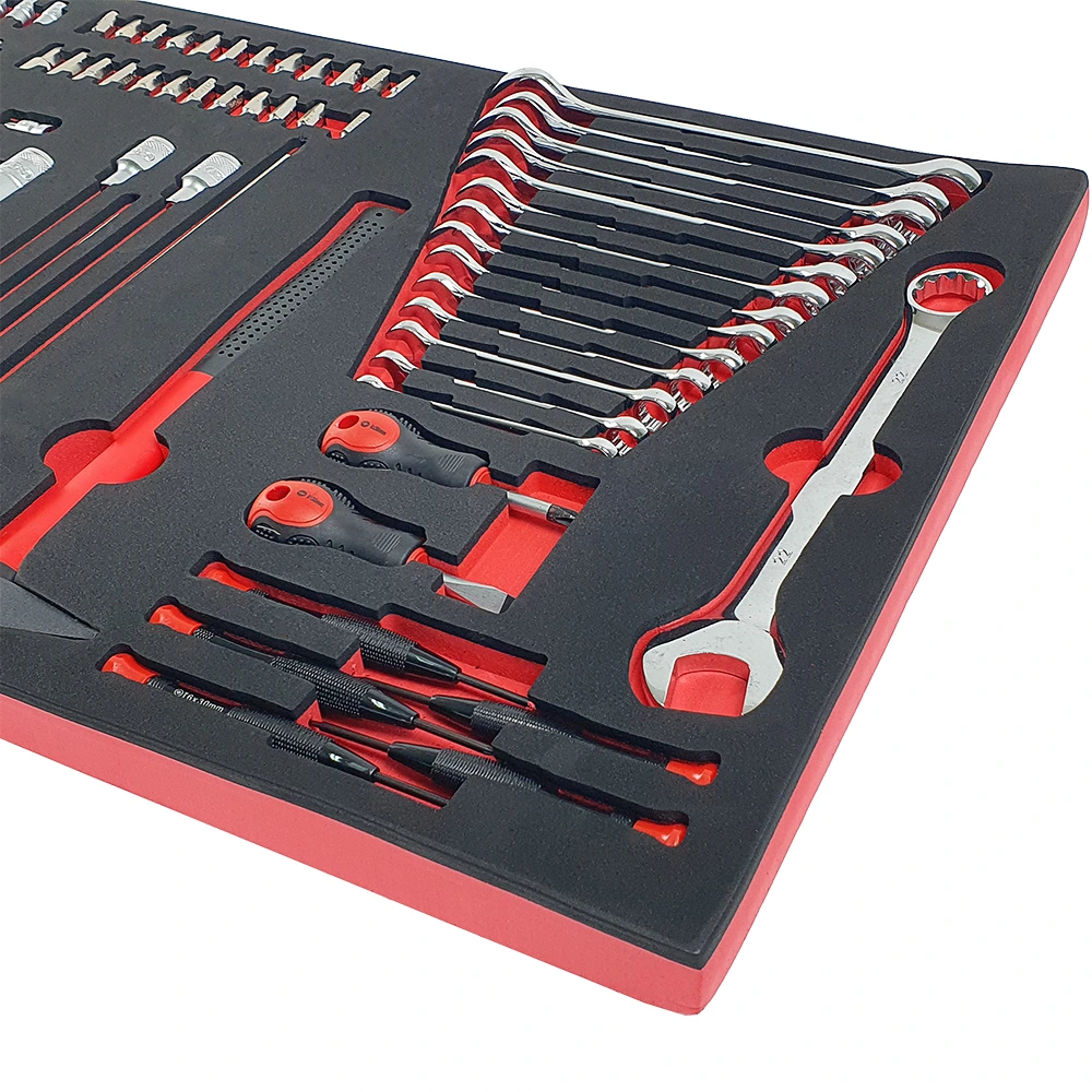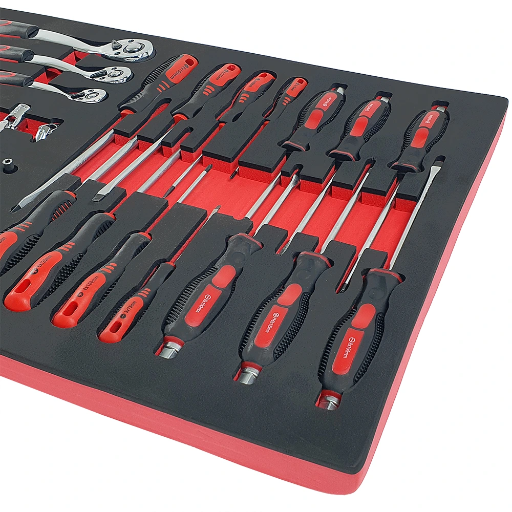 Narzędzia są umieszczone w estetycznych, wyprofilowanych wkładach z pianki EVA, które zapewniają doskonałą organizację i porządek w warsztacie. Wkłady idealnie pasują do wózków warsztatowych i szaf narzędziowych, co pozwala na szybki dostęp do potrzebnych narzędzi i utrzymanie ładu w miejscu pracy (wymiary wkładu: 40,5cm x 83,7cm).
