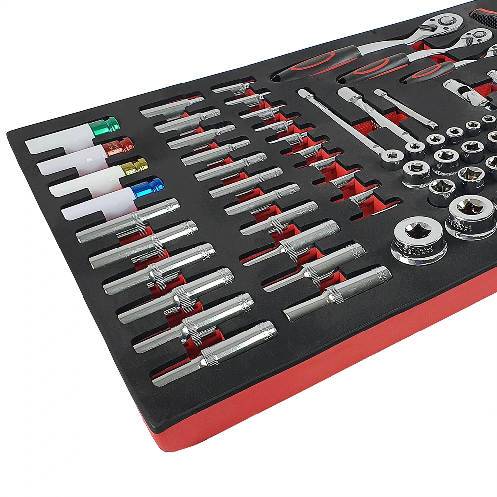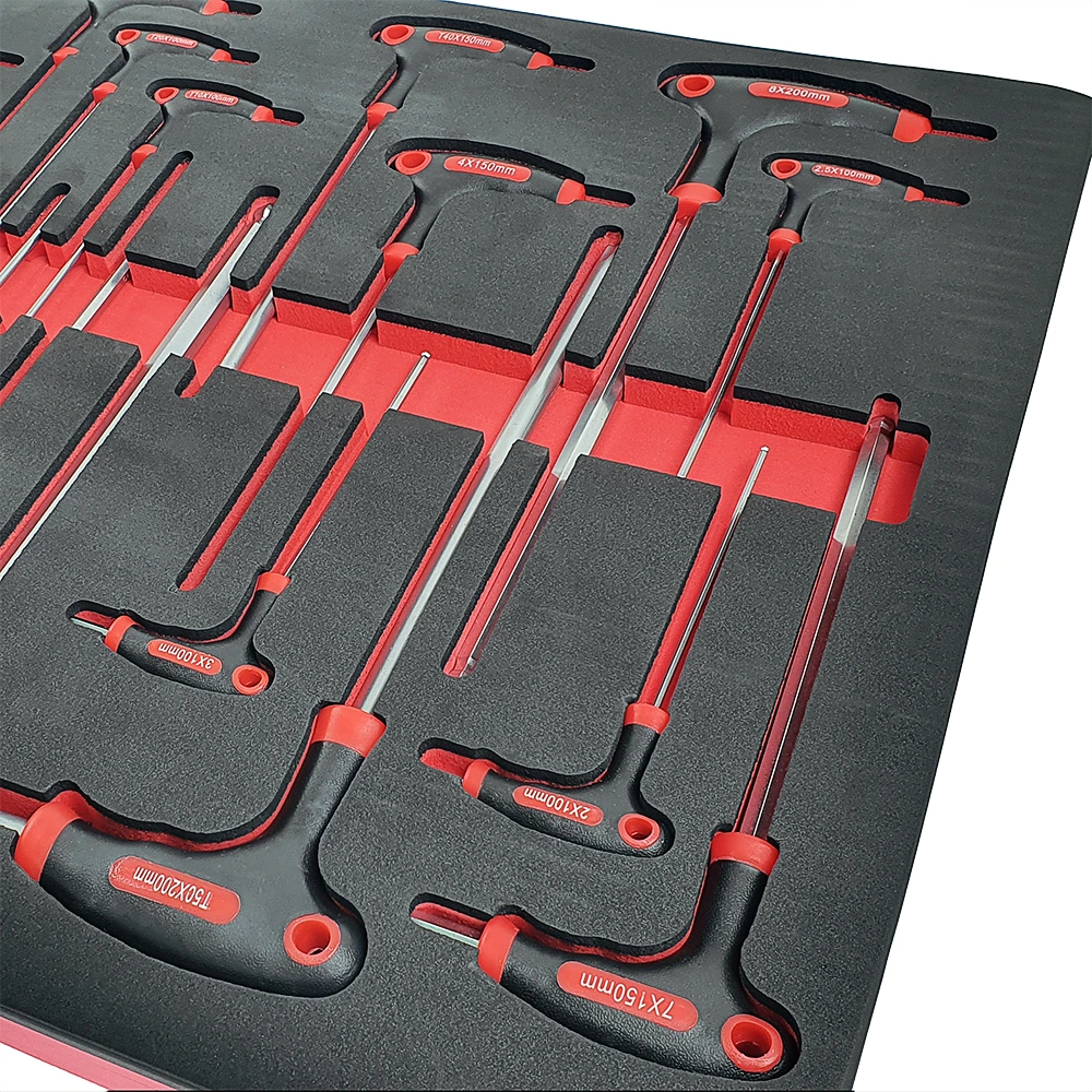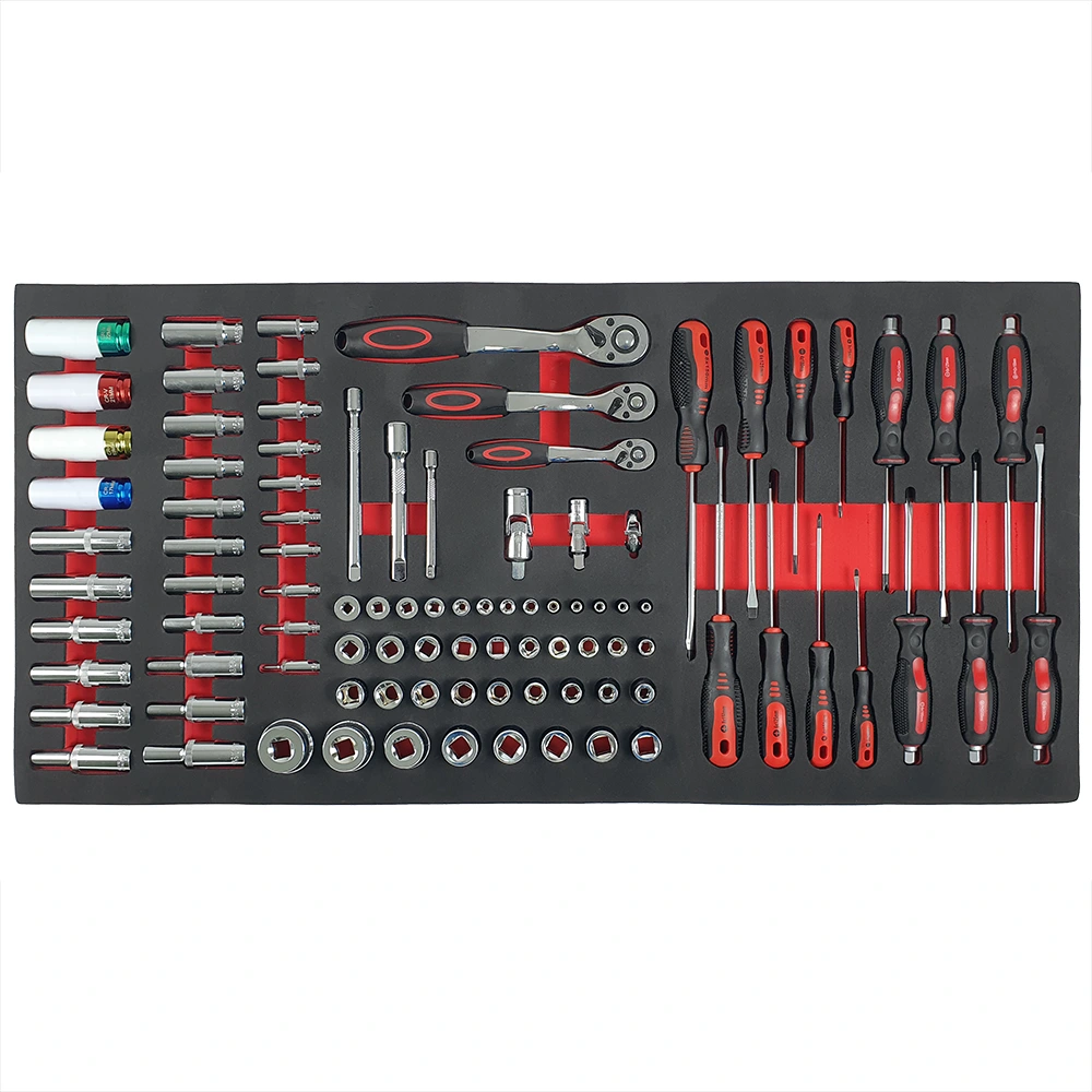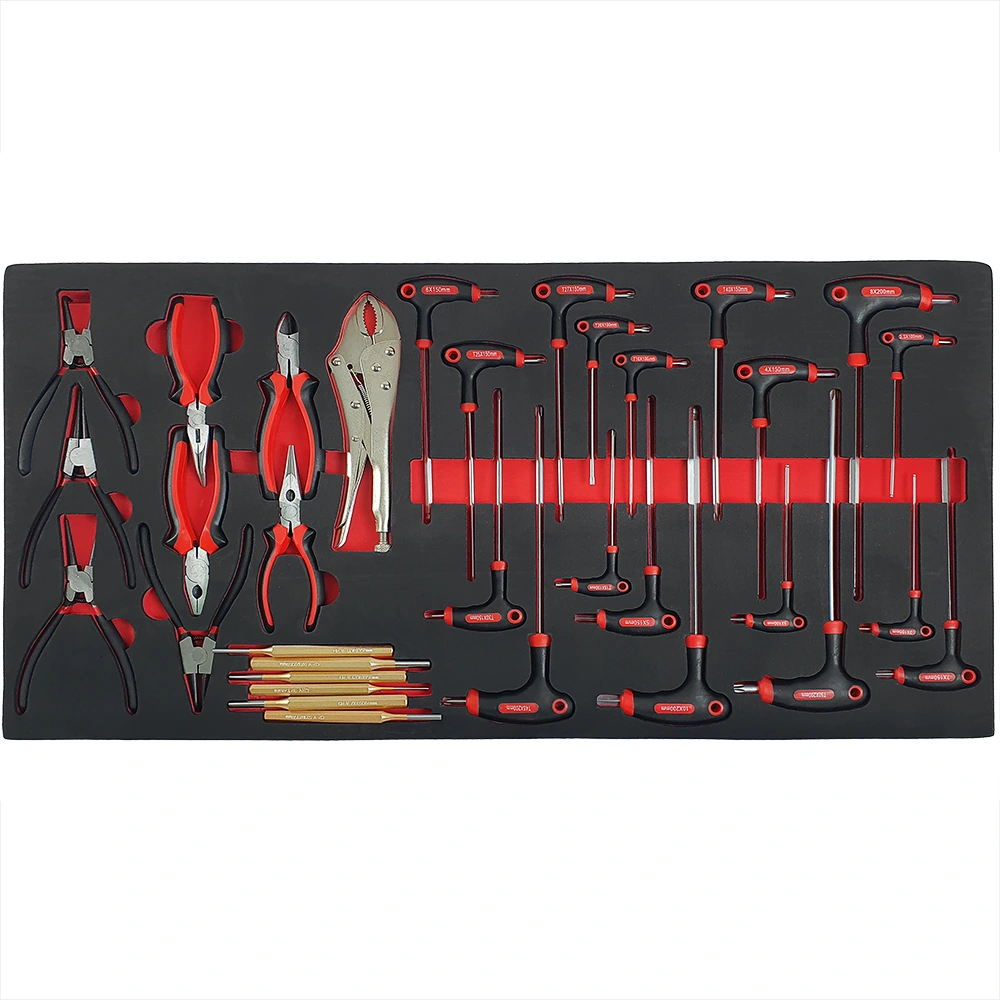 Narzędzia są umieszczone w estetycznych, wyprofilowanych wkładach z pianki EVA, które zapewniają doskonałą organizację i porządek w warsztacie. Wkłady idealnie pasują do wózków warsztatowych i szaf narzędziowych, co pozwala na szybki dostęp do potrzebnych narzędzi i utrzymanie ładu w miejscu pracy (wymiary wkładu: 40,5cm x 83,7cm).