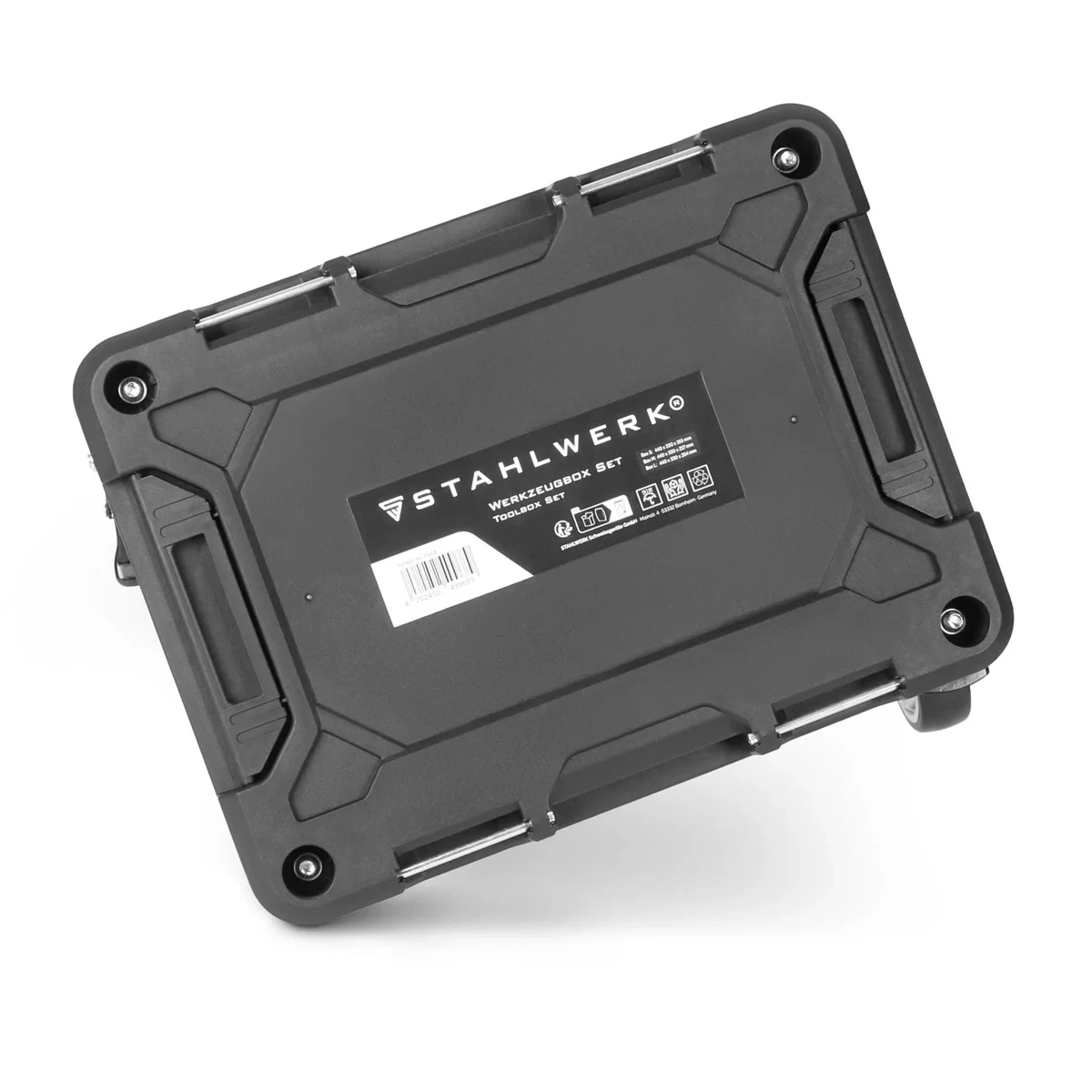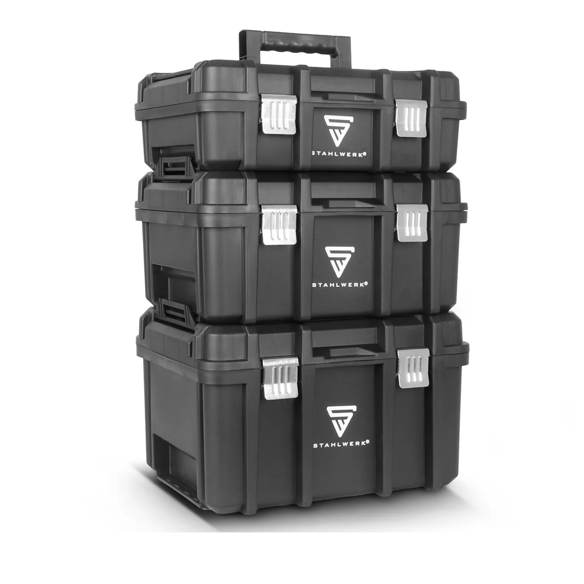 Mobilny zestaw 3 skrzynek narzędziowych STAHLWERK w systemie modułowym to kompleksowe rozwiązanie do przechowywania i transportu narzędzi, które łączy funkcjonalność z wysoką trwałością. Solidne skrzynki wykonane z wytrzymałego tworzywa PP można łatwo łączyć ze sobą dzięki inteligentnemu mechanizmowi zatrzaskowemu, co umożliwia szybkie tworzenie zestawów dopasowanych do indywidualnych potrzeb. W skład kompletu wchodzą trzy skrzynki transportowe o różnych rozmiarach oraz dwa małe organizery na śruby, narzędzia i drobne elementy, które można włożyć do większych skrzyń. Każda skrzynka posiada ergonomiczny uchwyt, a modułowa konstrukcja pozwala łatwo przenosić i układać skrzynki w warsztacie, garażu czy w terenie podczas pracy mobilnej.