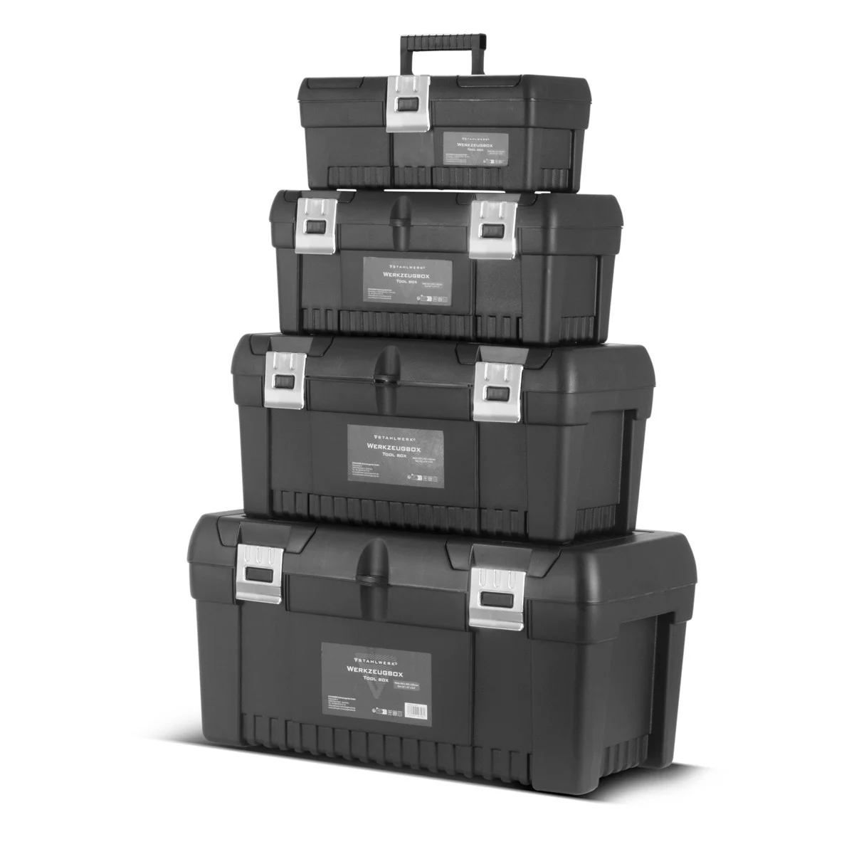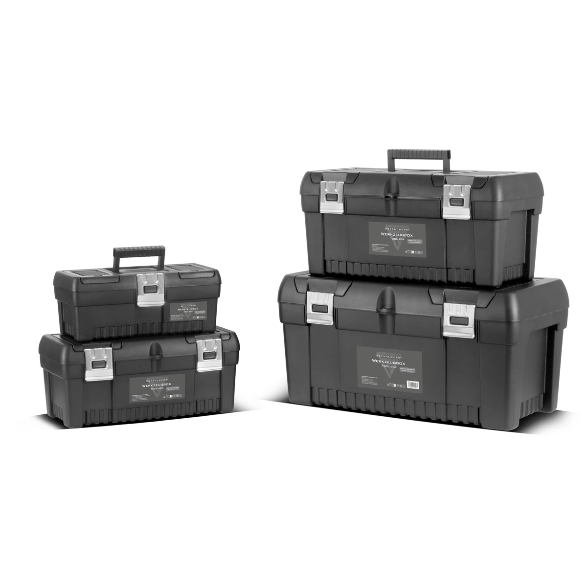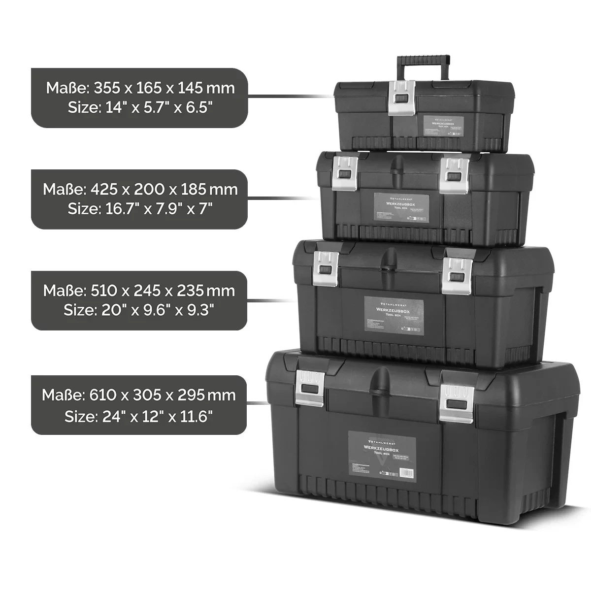 - Skrzynki narzędziowe STAHLWERK: 1 x skrzynka 355 x 165 x 145 mm, 1 x skrzynka 425 x 200 x 185 mm, 1 x skrzynka 510 x 245 x 235 mm, 1 x skrzynka 610 x 305 x 295 mm.