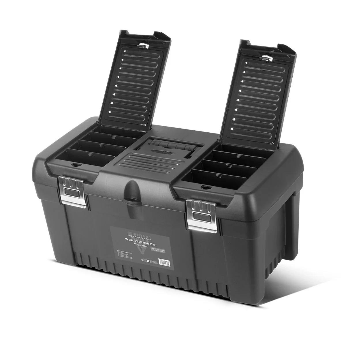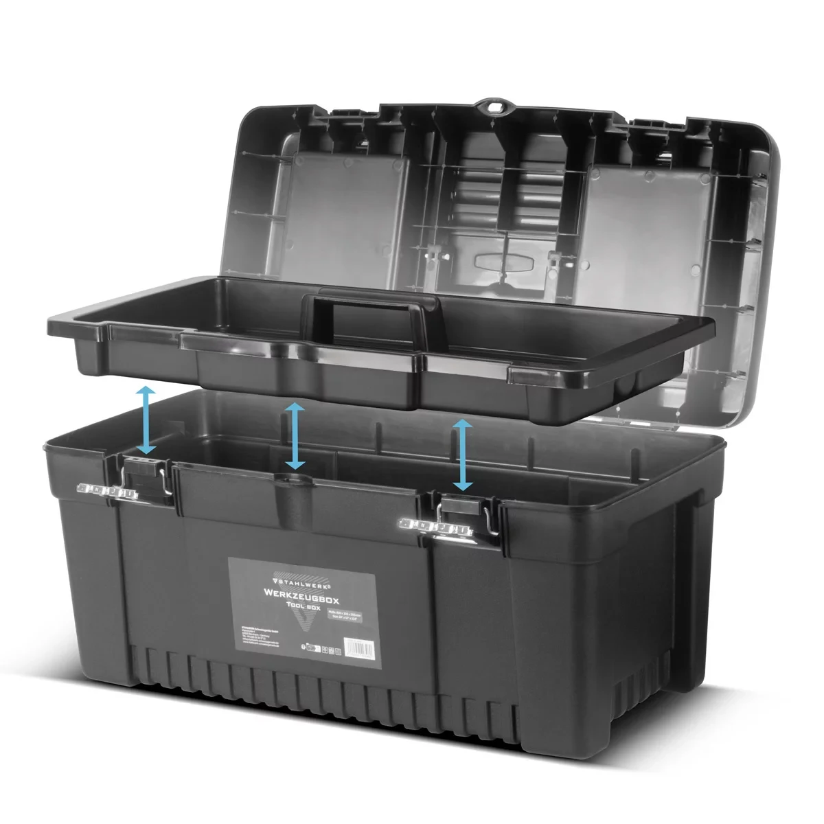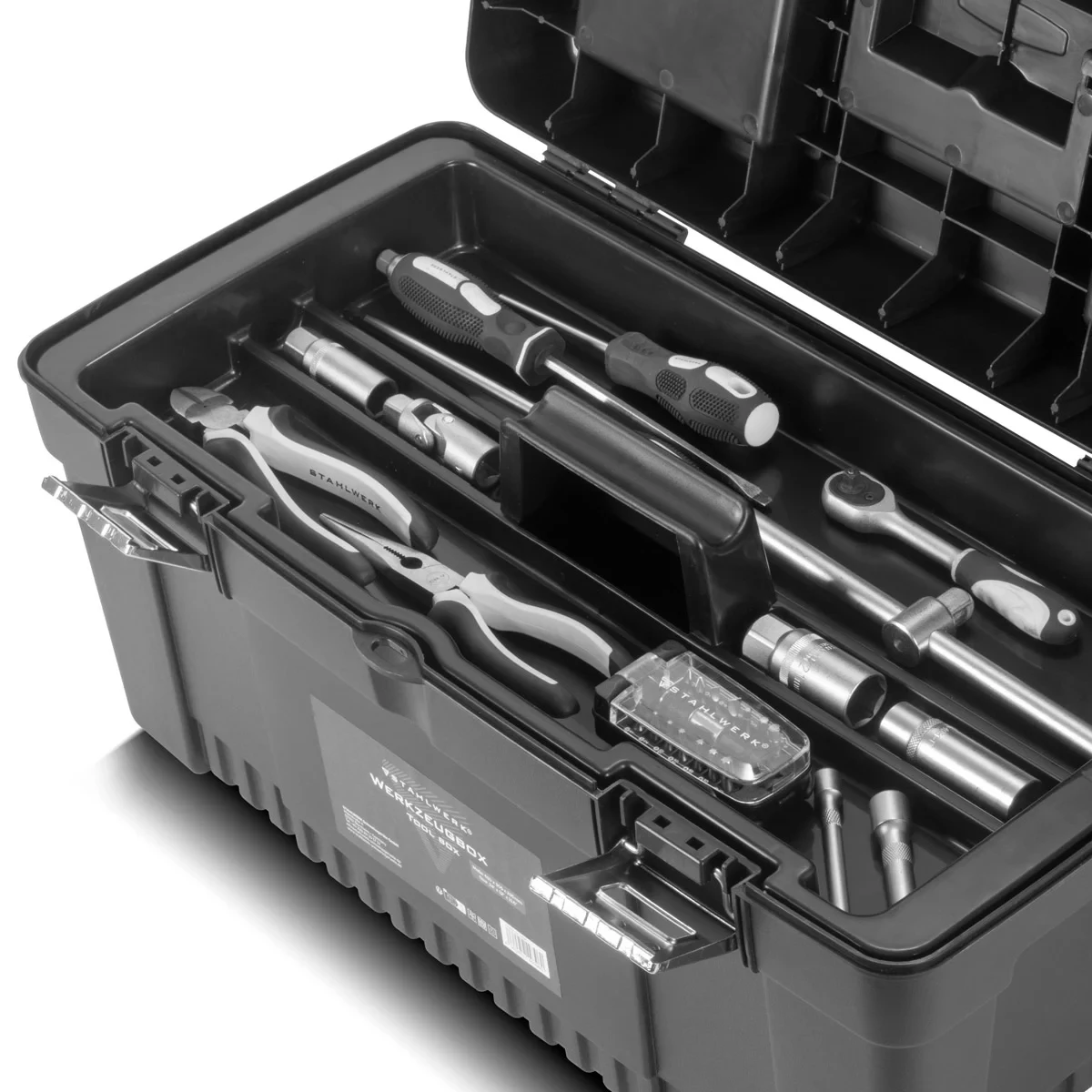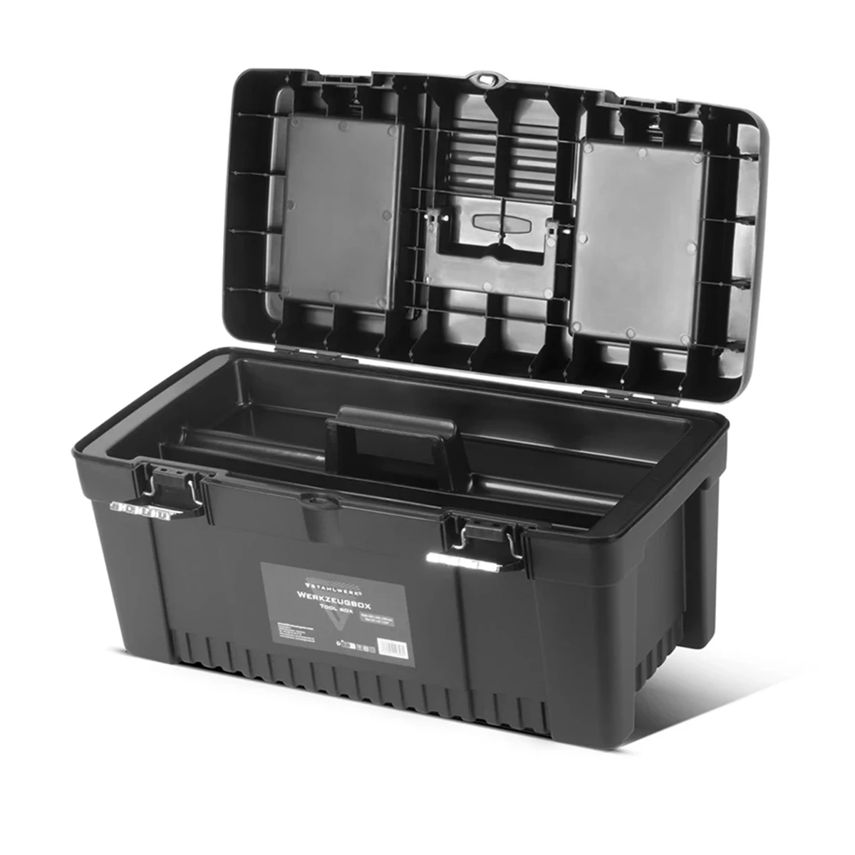 - Skrzynki narzędziowe STAHLWERK: 1 x skrzynka 355 x 165 x 145 mm, 1 x skrzynka 425 x 200 x 185 mm, 1 x skrzynka 510 x 245 x 235 mm, 1 x skrzynka 610 x 305 x 295 mm.