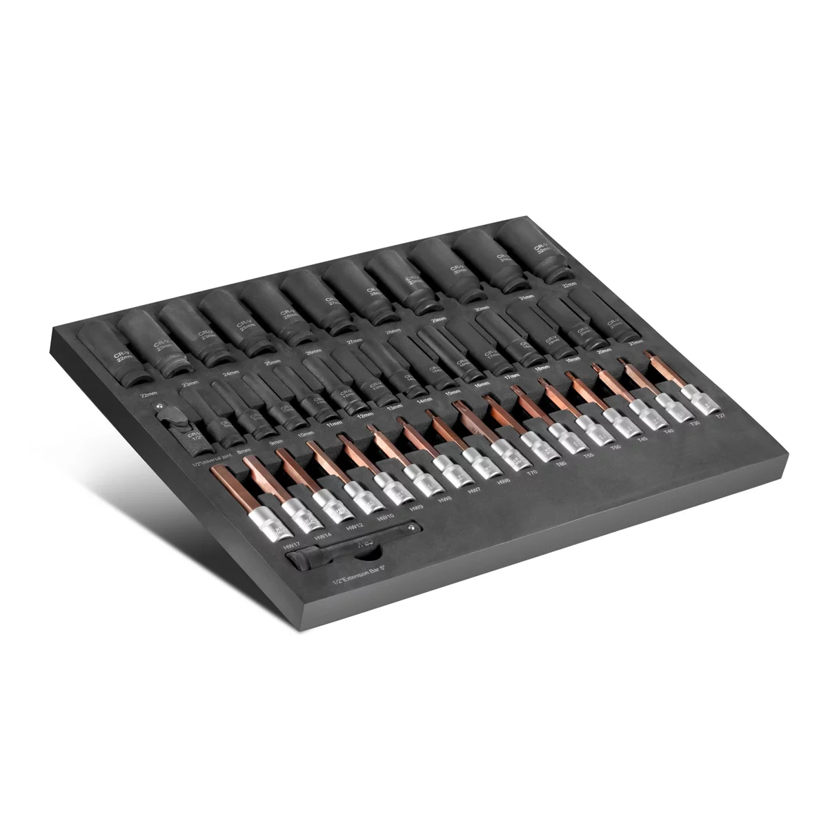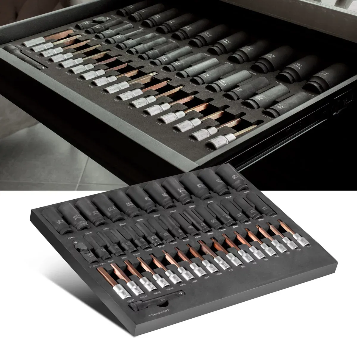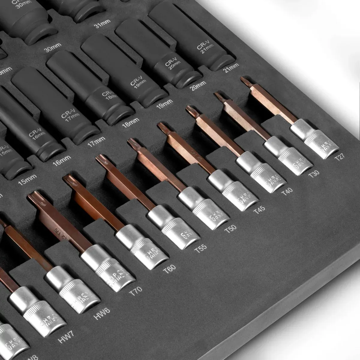 Nasadki zawarte w zestawie obejmują wszystkie standardowe rozmiary metryczne i mogą być bezpiecznie przechowywane w piankowej wkładce przeznaczonej do wózków warsztatowych. Zestaw zawiera również pasującą przedłużkę i przegub uniwersalny, dzięki czemu wszystkie elementy pozostają uporządkowane i zawsze pod ręką. Bogata gama narzędzi jest w pełni kompatybilna ze standardowymi wózkami warsztatowymi i montażowymi, co zapewnia wygodę podczas pracy. Zestaw sprawdza się doskonale w zastosowaniach profesjonalnych, w przemyśle motoryzacyjnym, handlu oraz w warsztacie domowym, gwarantując wysoką funkcjonalność i niezawodność.