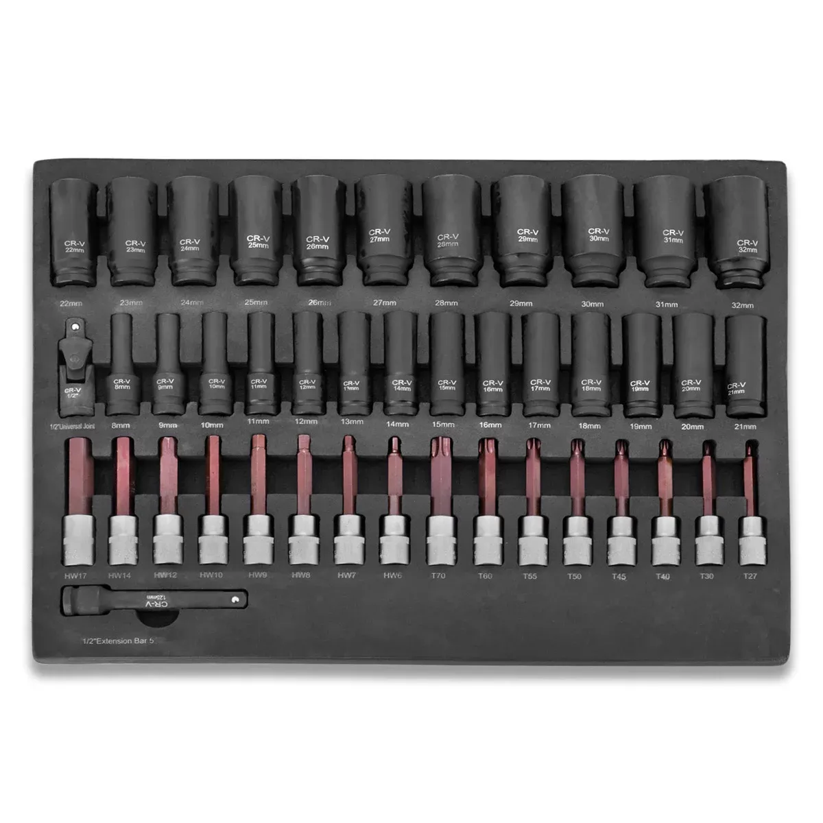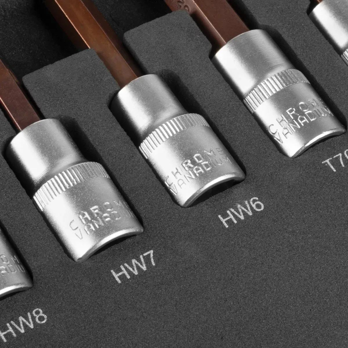 - 41 x Nasadka CR-V z gniazdem 1/2": gniazdo sześciokątne: 8, 9, 10, 11, 12, 13, 14, 15, 16, 17, 18, 19, 20, 21, 22, 23, 24, 25, 26, 27, 28, 29, 30, 31, 32 mm, TORX T27, T30, T40, T45, T50, T55, T60, T70; gniazdo sześciokątne: HW6, HW7, HW8, HW9, HW10, HW12, HW14, HW17.