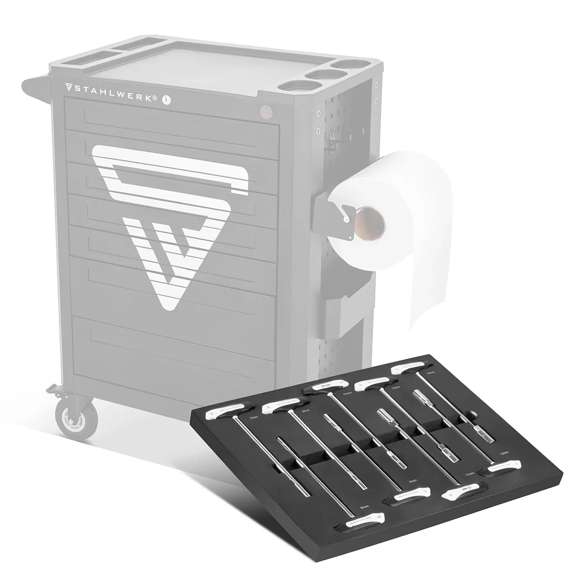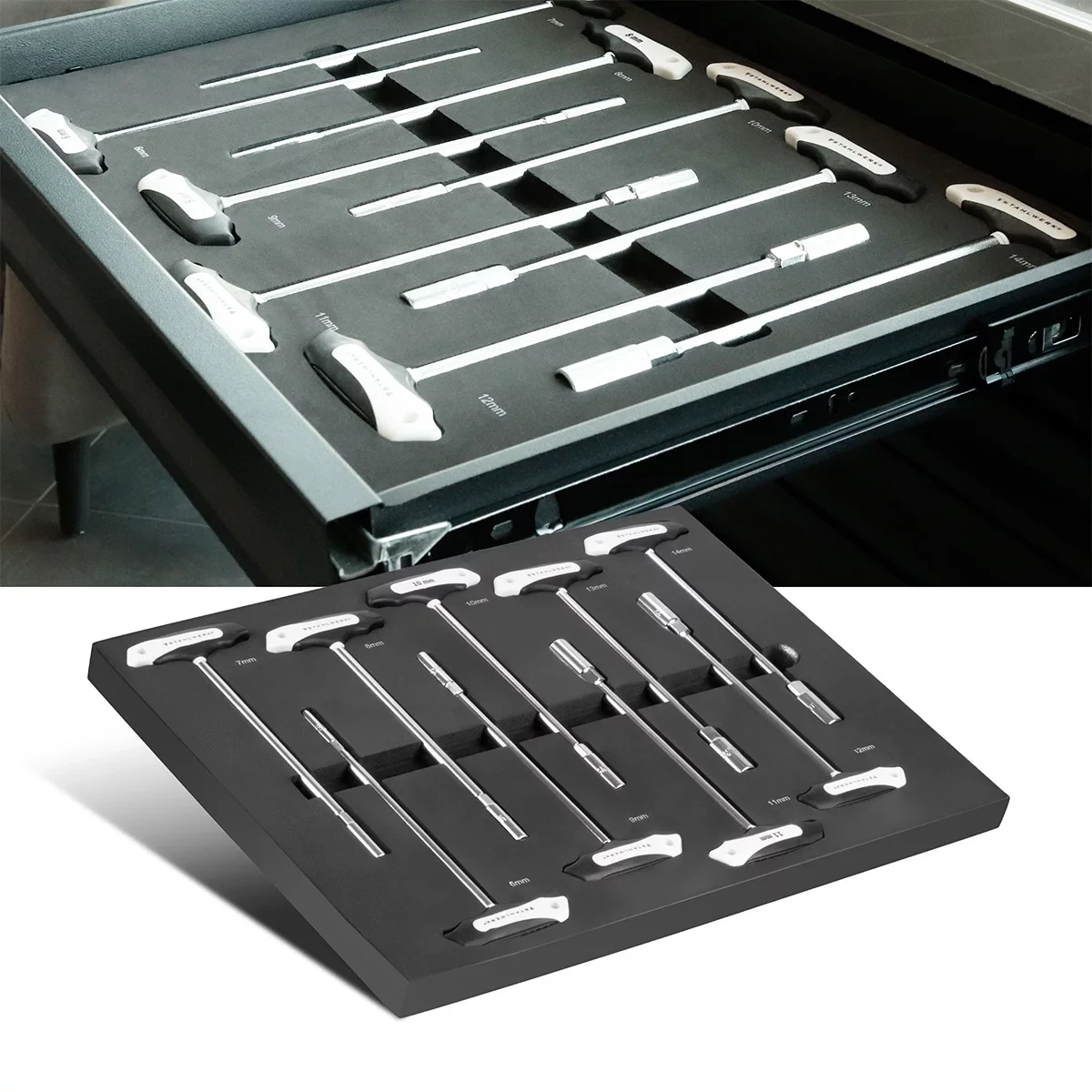 Nasadki dostępne w zestawie obejmują wszystkie standardowe rozmiary metryczne, dzięki czemu zestaw jest gotowy do zastosowania w większości standardowych zadań mechanicznych i montażowych. Piankowa wkładka nie tylko umożliwia bezpieczne przechowywanie wszystkich elementów w wózku warsztatowym, lecz także zapewnia przejrzysty przegląd i łatwy dostęp do narzędzi, co znacznie przyspiesza pracę i podnosi komfort użytkowania. Wkładka jest kompatybilna ze standardowymi wózkami warsztatowymi i montażowymi, a dzięki przemyślanej organizacji narzędzia zawsze pozostają na swoim miejscu, co minimalizuje ryzyko zgubienia lub uszkodzenia nasadek.