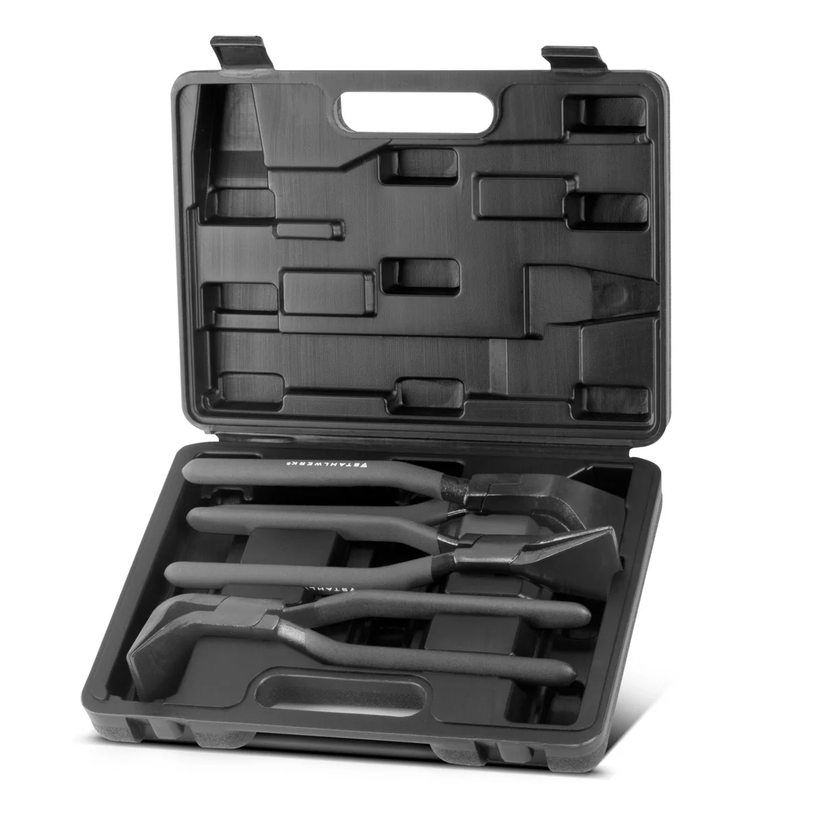 - Szczypce: 1 x szczypce zaciskowe STAHLWERK proste 0°, 1 x szczypce składane STAHLWERK kątowe 45°, 1 x szczypce składane STAHLWERK kątowe 90°.